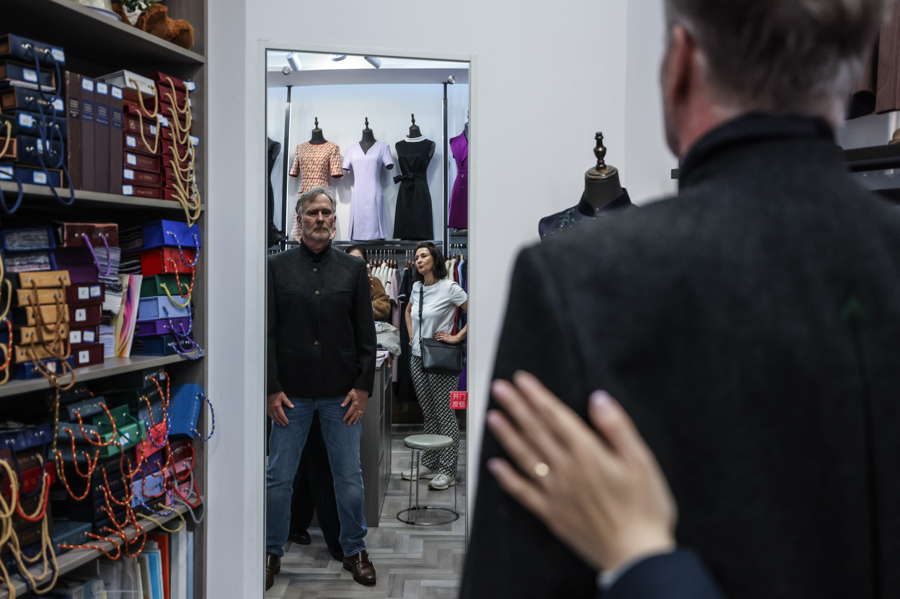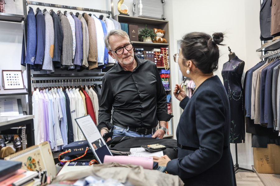 记者路过陈丹的店铺时,恰遇一对德国夫妇正在试衣。去年十二月,他们经朋友介绍在此定制了五六件衣服,此次是专程再度来访。陈丹全程陪同挑选面料、讨论款式、商量价格,前后忙碌近两小时,送走客人后才转身整理被翻乱的样衣。“做这行就得有耐心,”她说道,“客人远道而来,绝不能敷衍。”