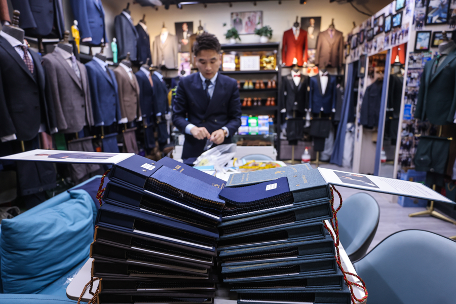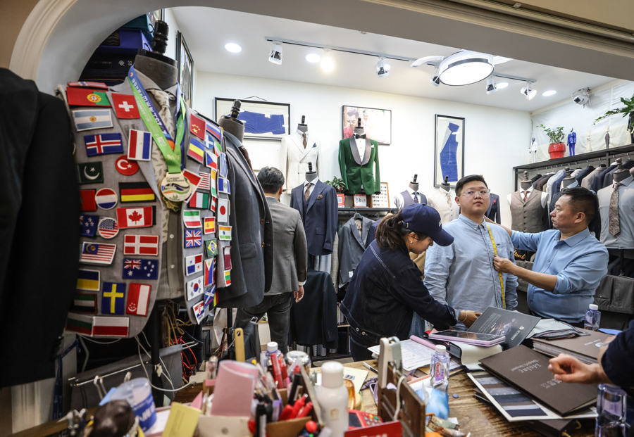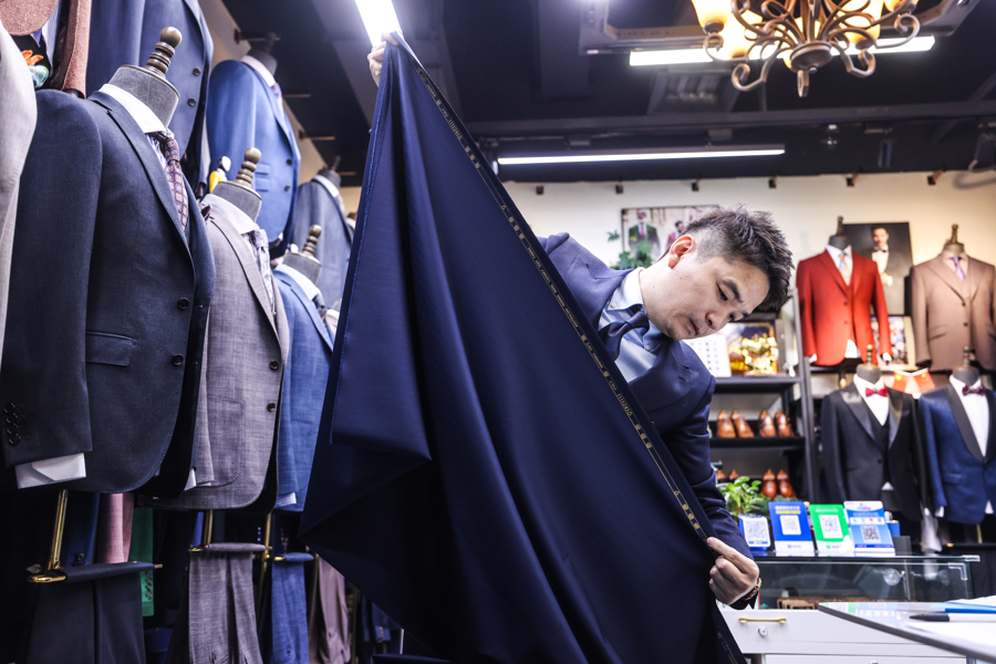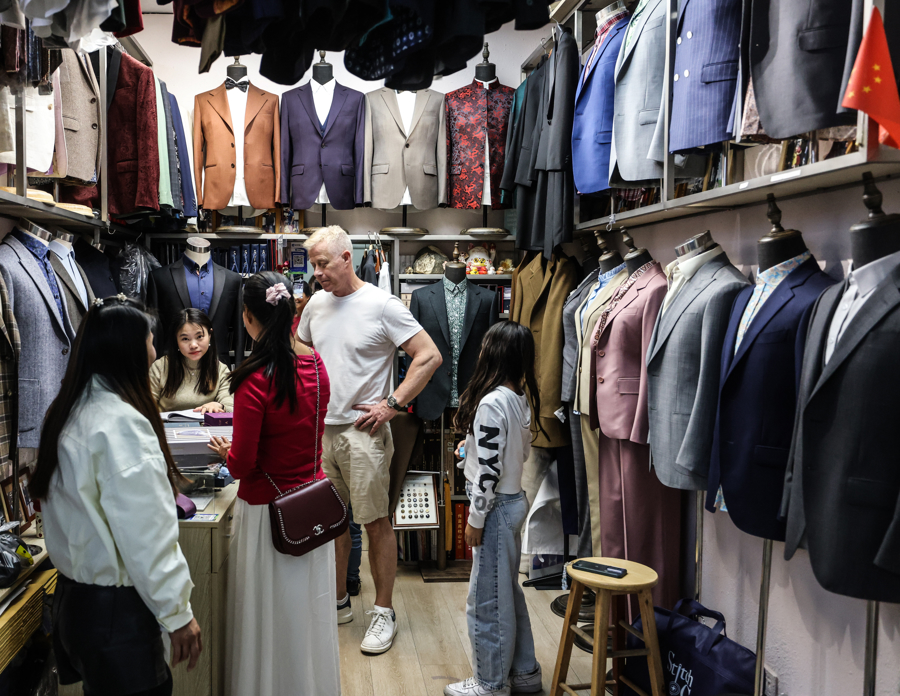 这种“高性价比+快交付”的独特模式,经口碑发酵迅速在国际游客中走红。如今,这里外国客户占比已超50%,部分热门店铺更高达70%。不少游客拖着行李箱慕名而来,人均消费约2万元。正如一位美国游客所言:“就像你们去欧洲带巧克力一样,我们来中国,一定要带一套这里定制的西装。”