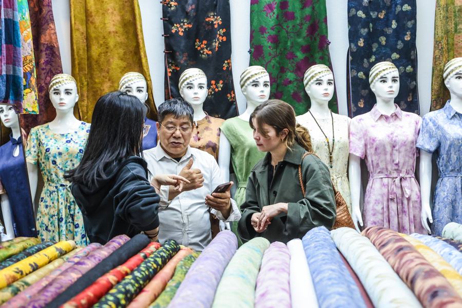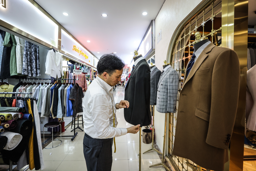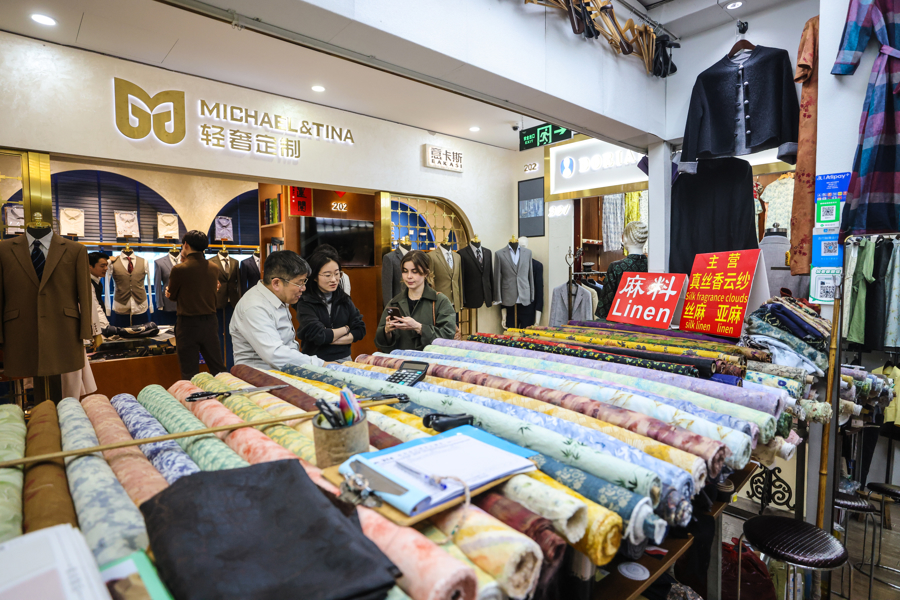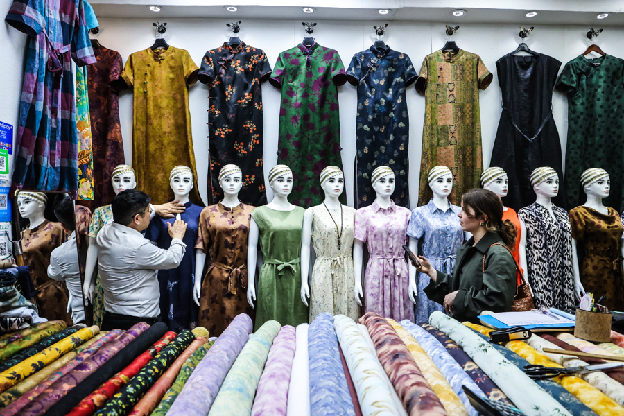 市场汇聚了约285家店铺,以“前店后厂”模式提供从面料甄选到西装、旗袍、礼服、日常穿搭的一站式定制服务,部分商铺也售卖成衣,品类十分齐全。顾客可沉浸式参与选料、设计全流程。而免签政策的落地与邮政服务的入驻,更让这里成为外国游客的热门打卡地,支持成衣直寄全球170多个国家和地区。