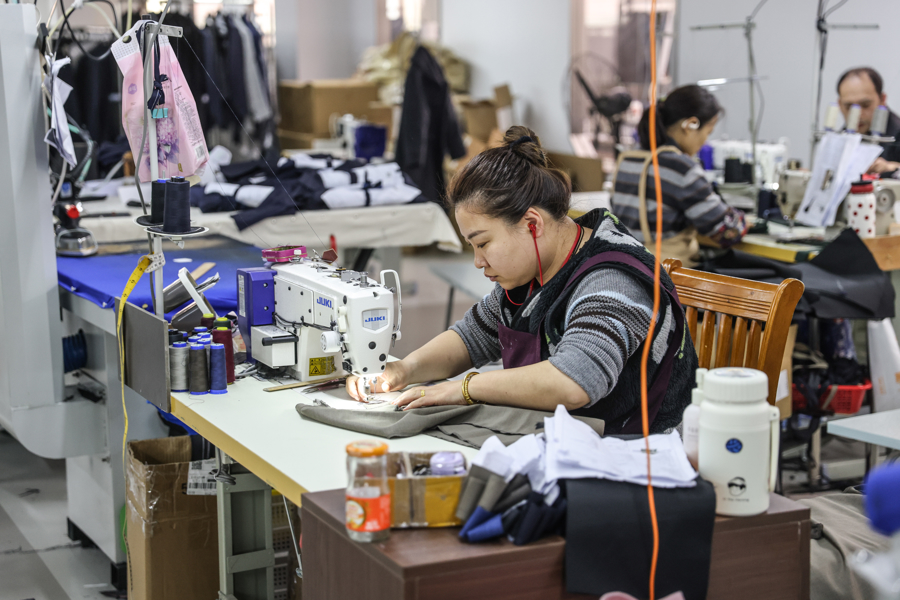 毛永康在位于昆山的定制工厂内与员工交流服装制作的工艺和细节。