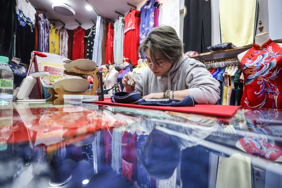 博旺服饰定制的二代接班人陈洁正在为定制旗袍进行手工烫钻。